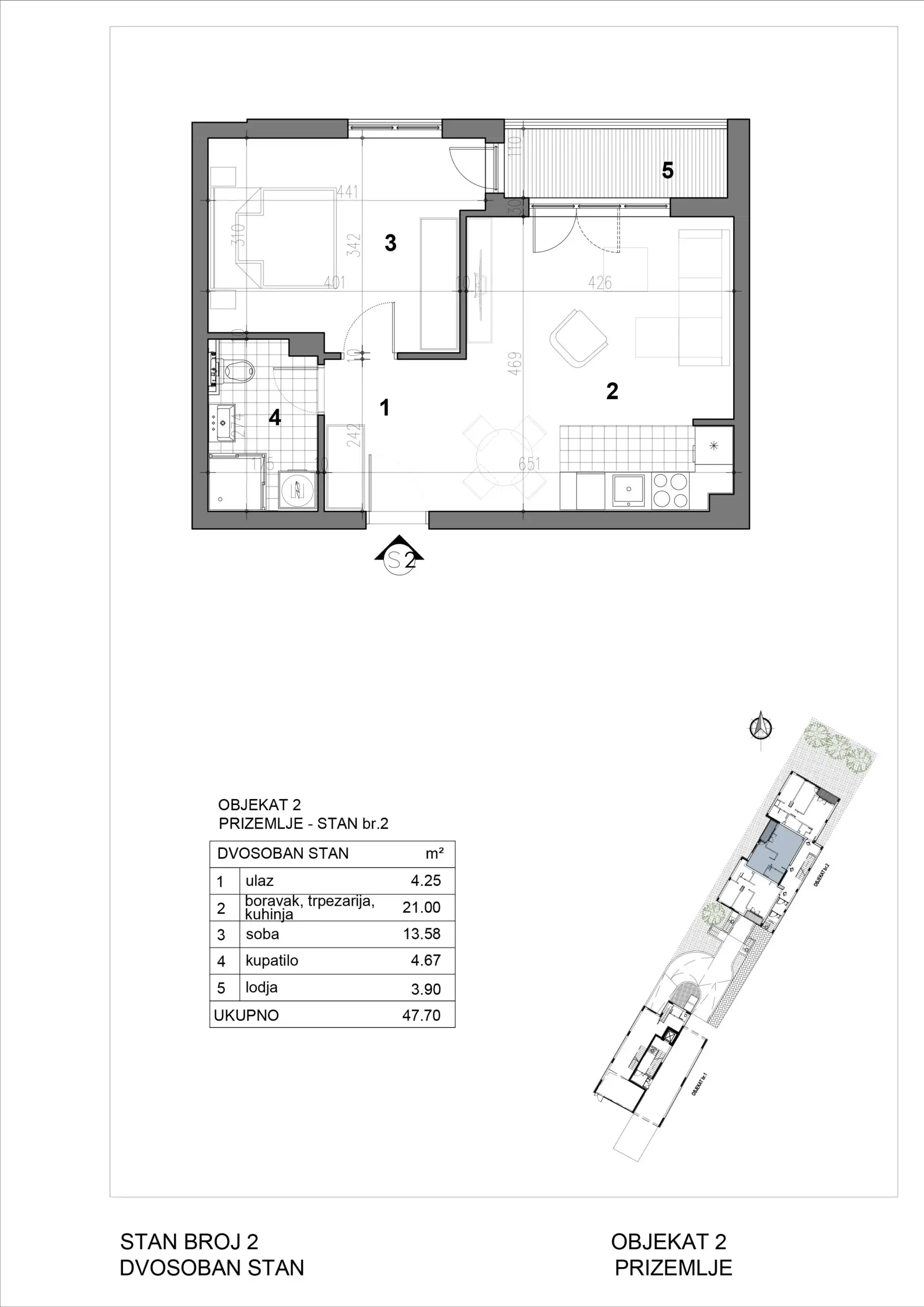 | Prizemlje | Stan 02 | 47.70 | 2600€/m2 | dvosoban | Prodato | Pogledajte nacrt |