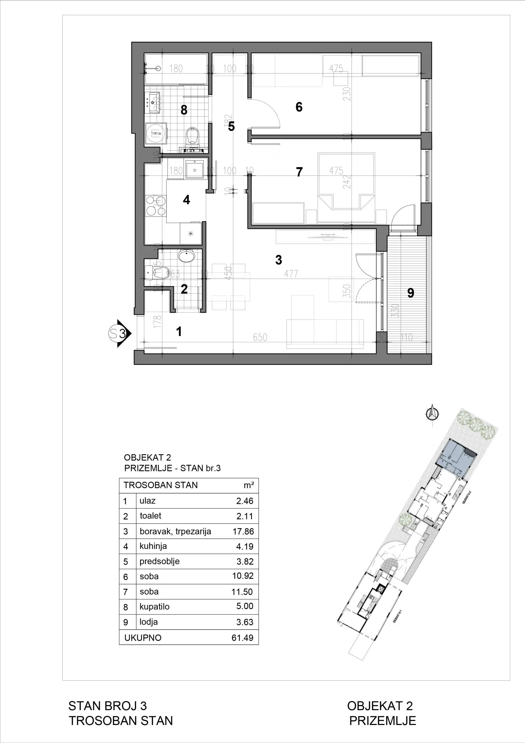 | Prizemlje | Stan 03 | 61.49 | 2600€/m2 | trosoban | Prodato | Pogledajte nacrt |