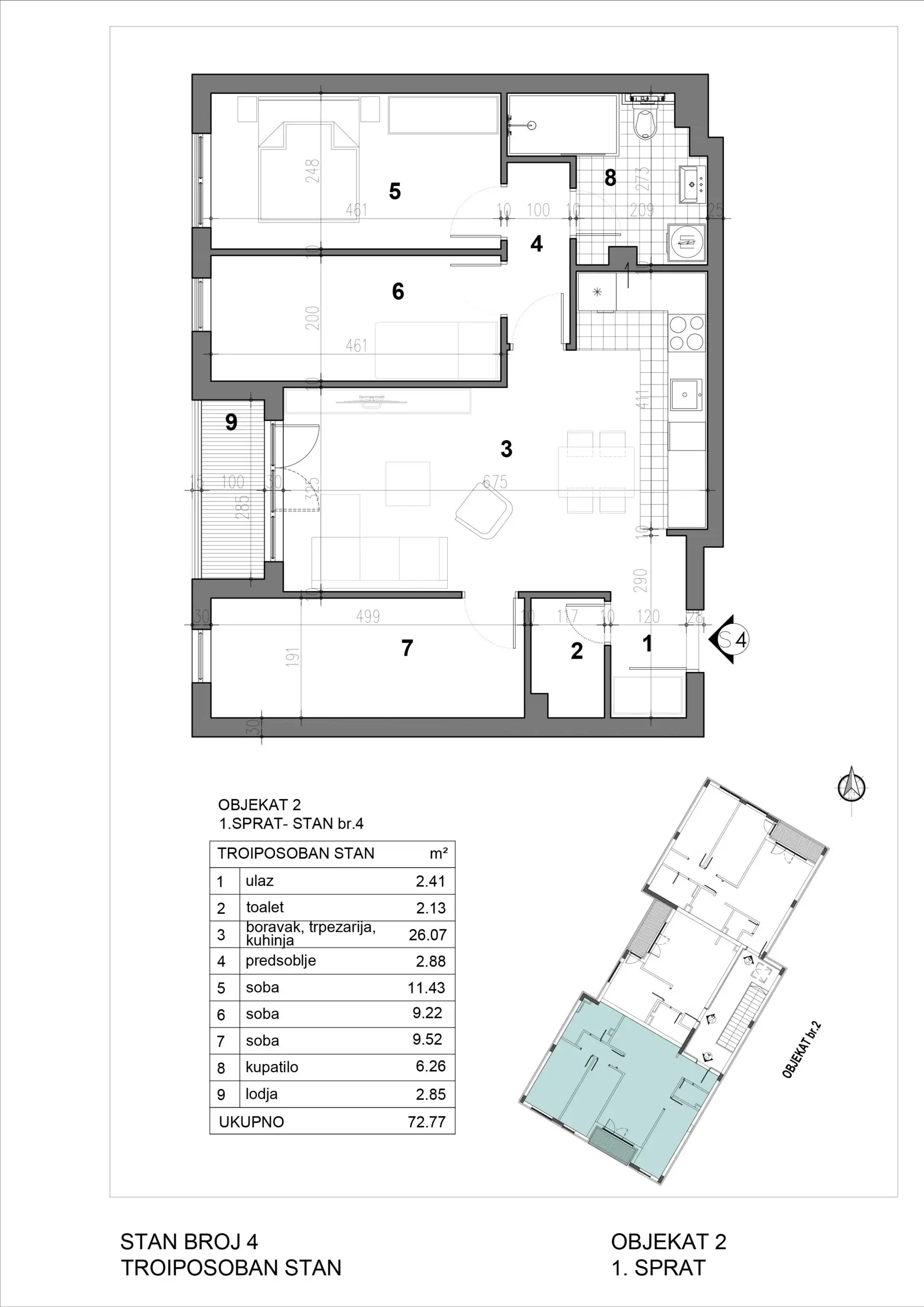 | I sprat | Stan 04 | 72.77 | 2600€/m2 | troiposoban | Prodato | Pogledajte nacrt |