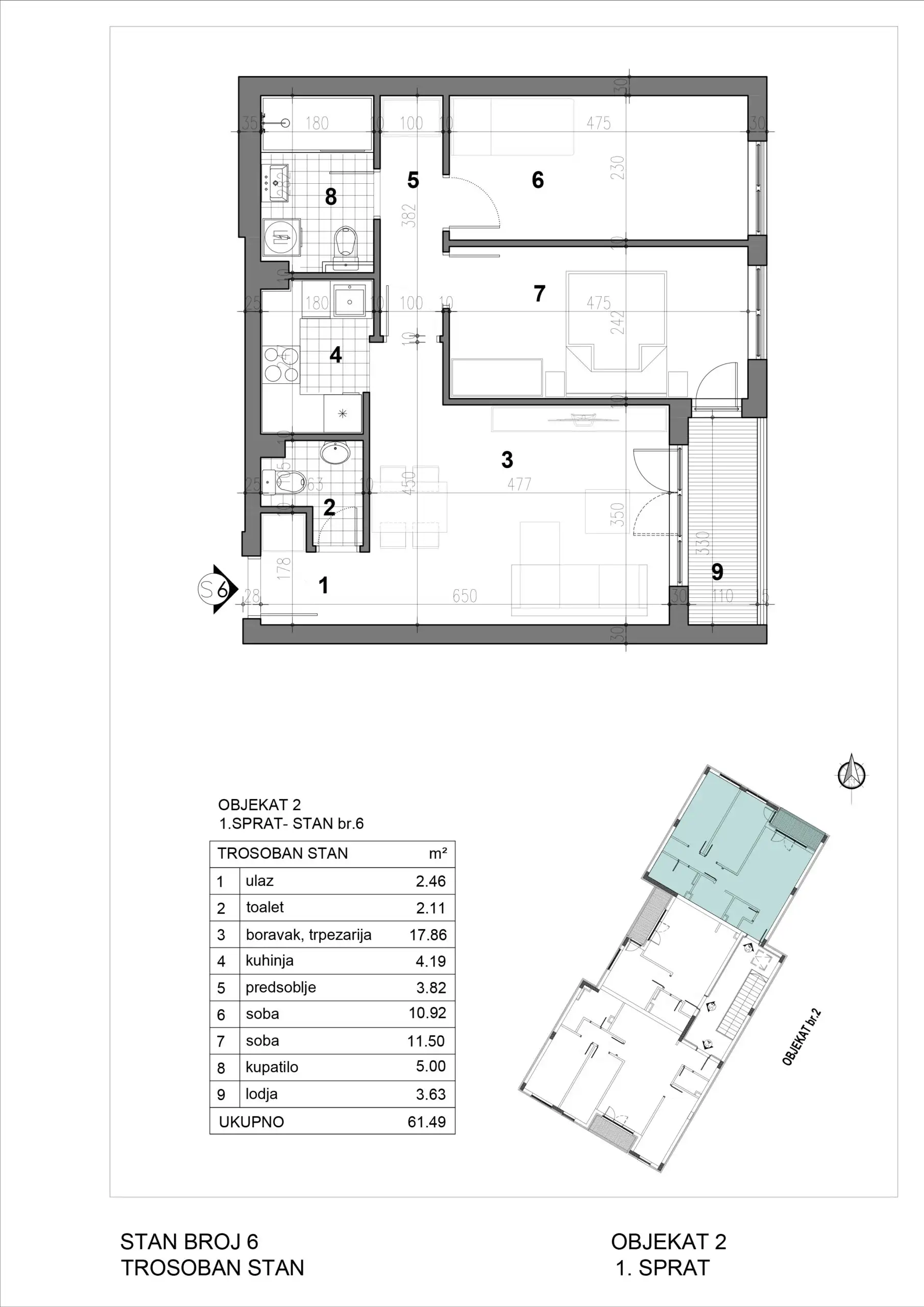| I sprat | Stan 06 | 61.49 | 2600€/m2 | trosoban | Prodato | Pogledajte nacrt |