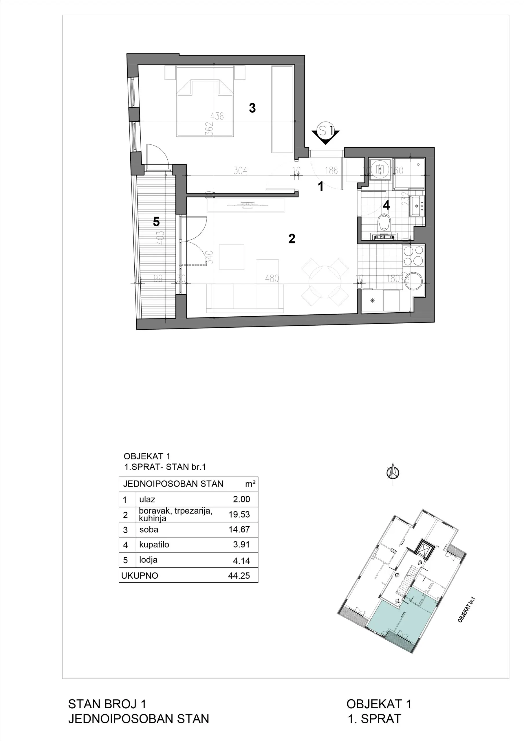 | I sprat | Stan 01 | 44.25 | 2600€/m2 | jednoiposoban | Prodato | Pogledajte nacrt |