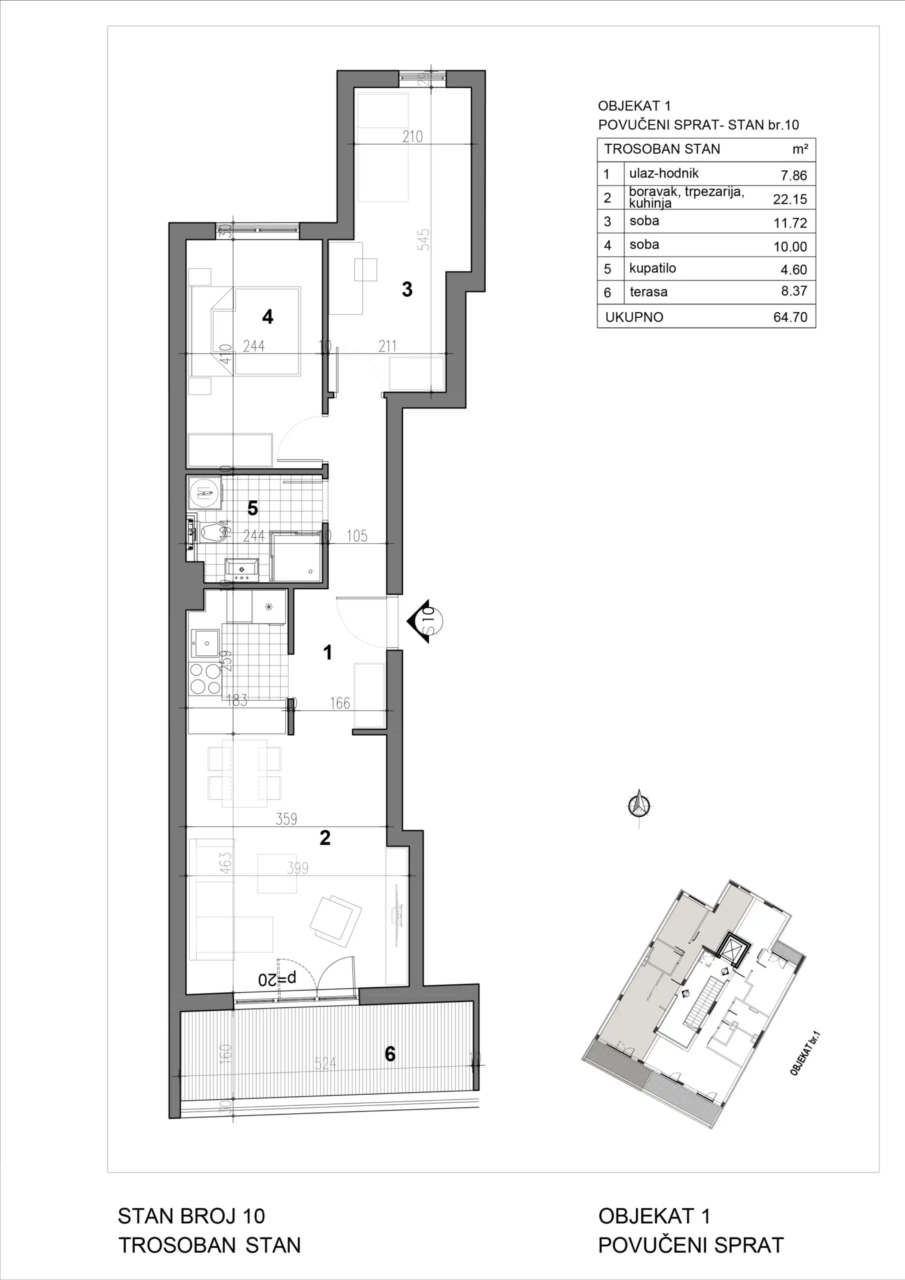 | Povučen sprat | Stan 10 | 64.70 | 2600€/m2 | trosoban | Prodato | Pogledajte nacrt |