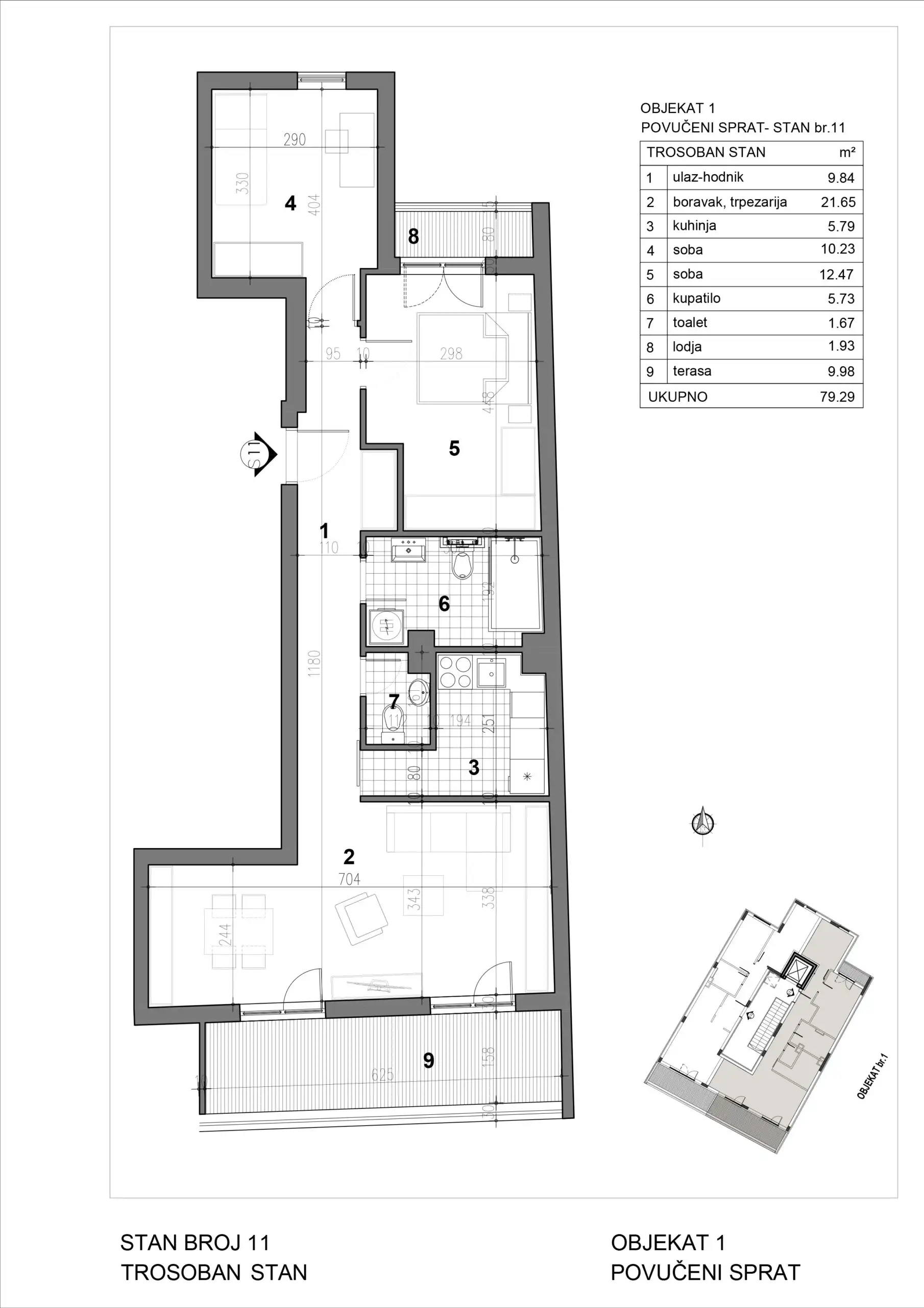 | Povučen sprat | Stan 11 | 79.29 | 2800€+pdv/m2 | trosoban | Slobodan | Pogledajte nacrt |