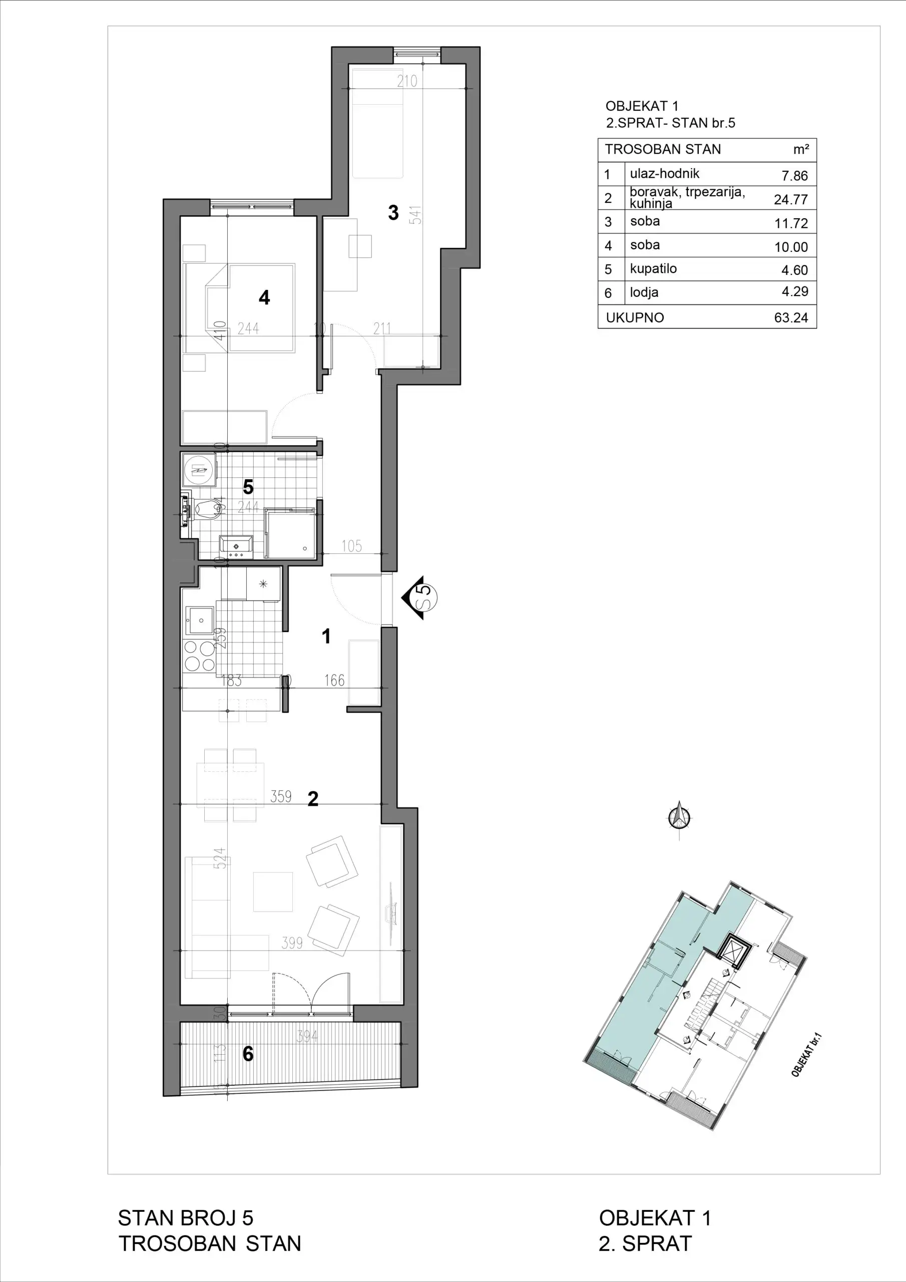 | I sprat | Stan 02 | 63.24 | 2800€/m2 | trosoban | Prodato | Pogledajte nacrt |